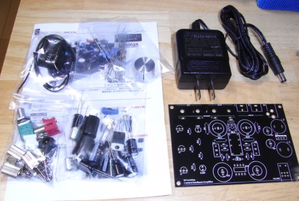 開けてみると基板を含めた内容は以下のような感じです。ACアダプタも付いているので完成するとすぐに使えます。(入力はRCAコネクタなので持っていない方は準備が必要です。)